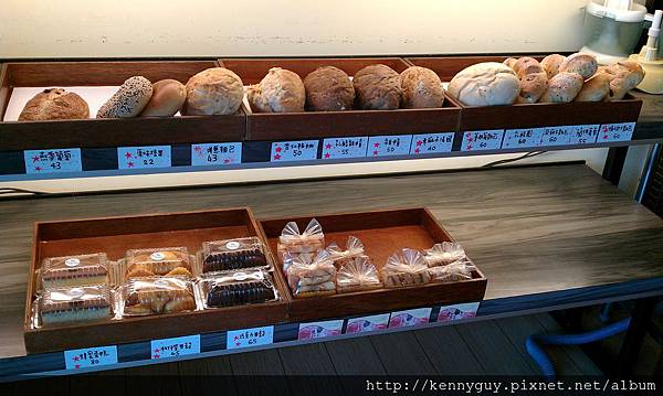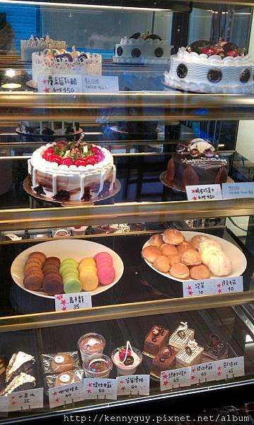 一進門可見許多蛋糕及麵包