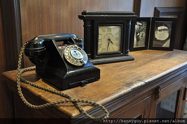 上面有古早的電話 古早的時鐘 古早的照片