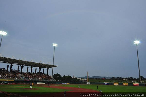 太陽有短暫露出一點點臉 球場上方出現一道淡淡的彩虹!